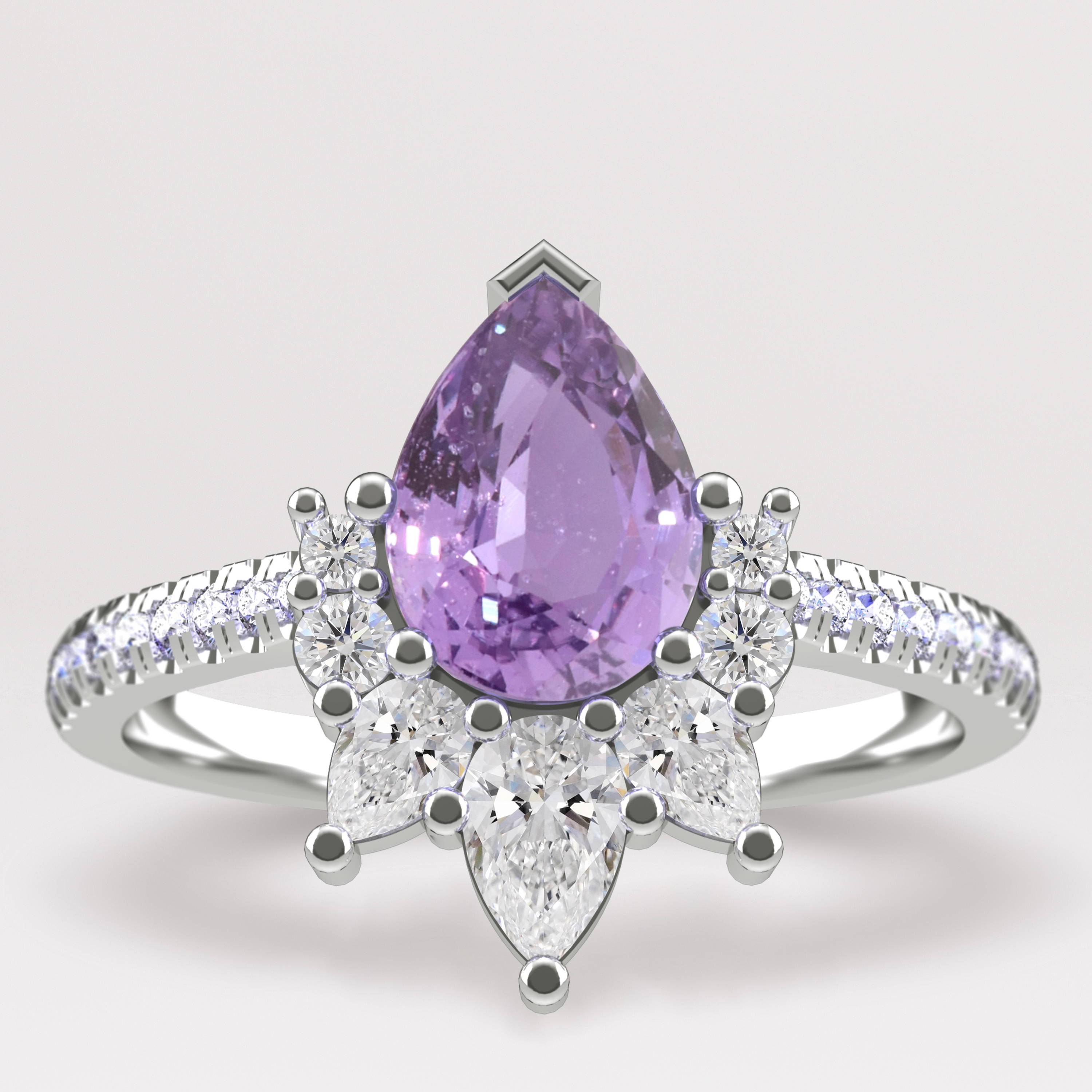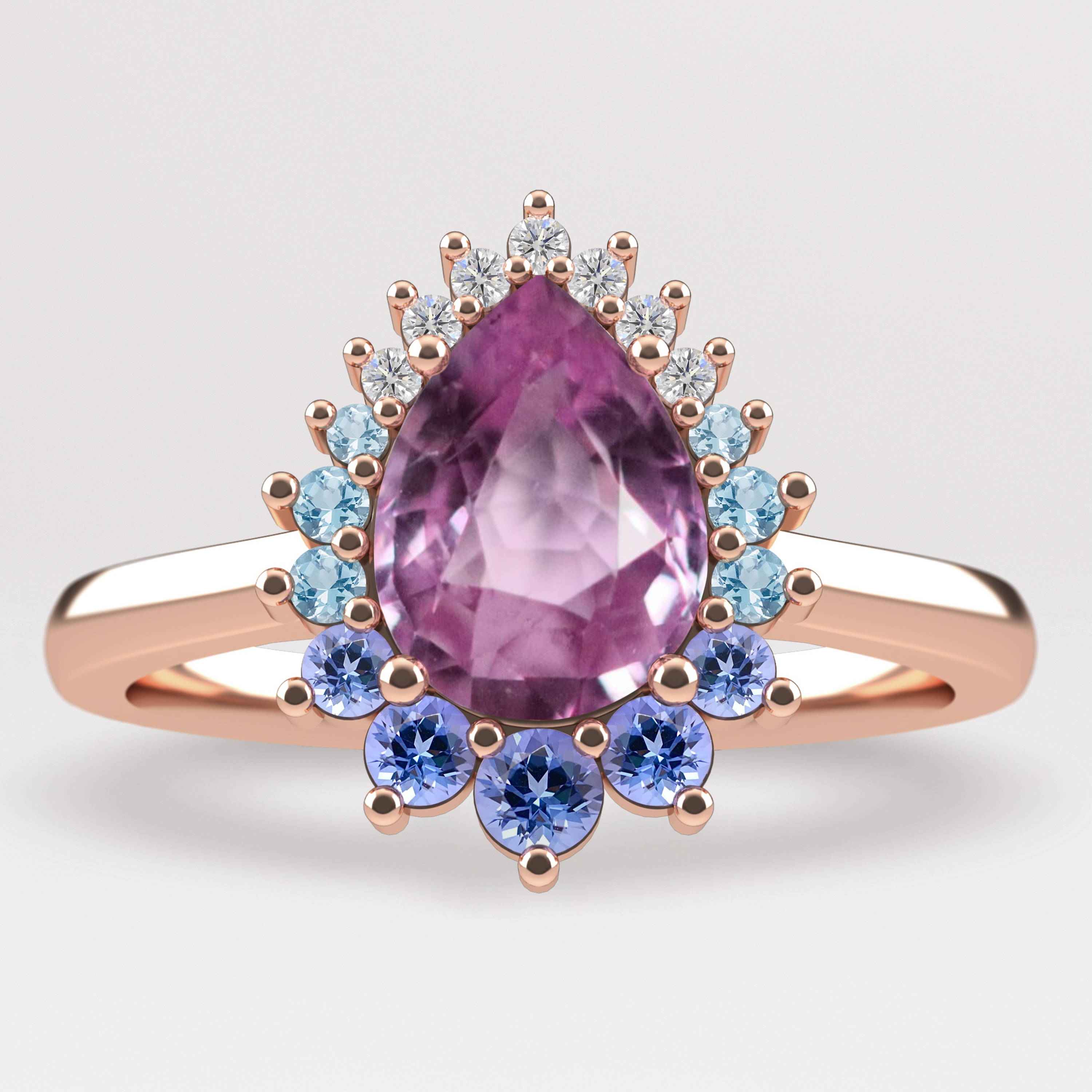 Ladies and gentlemen, will you please stand? The Lover ring features a stunning pink pear cut sapphire, and is surrounded by a halo of diamonds, blue sapphires, and tanzanites, creating an incredible ombre of colours inspired by the gorgeous tones on the album cover. Lover was Taylor’s first album that was completely hers. After breaking free of record labels we won’t mention here, Taylor was able to own the masters for her Lover album, and was inspired to re-record her past albums so she could own those too.