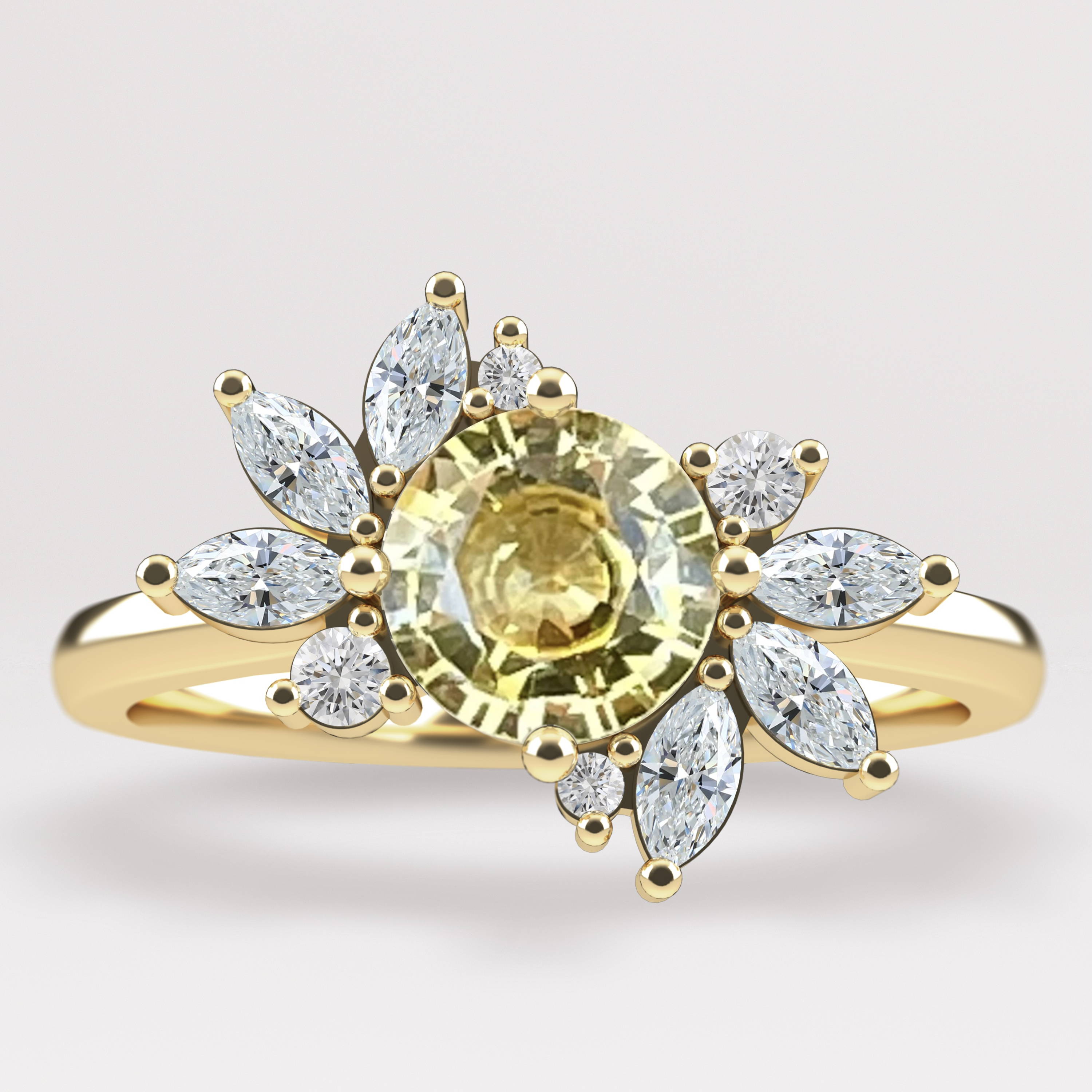 The Abi ring is inspired by Taylor swift’s iconic “Fearless spin”. Featured in her Fearless Tour, and recently her Era’s tour, which always gets the fans going crazy. Yellow was the obvious choice for this centre stone, inspired by the gorgeous golden shade of her album cover.