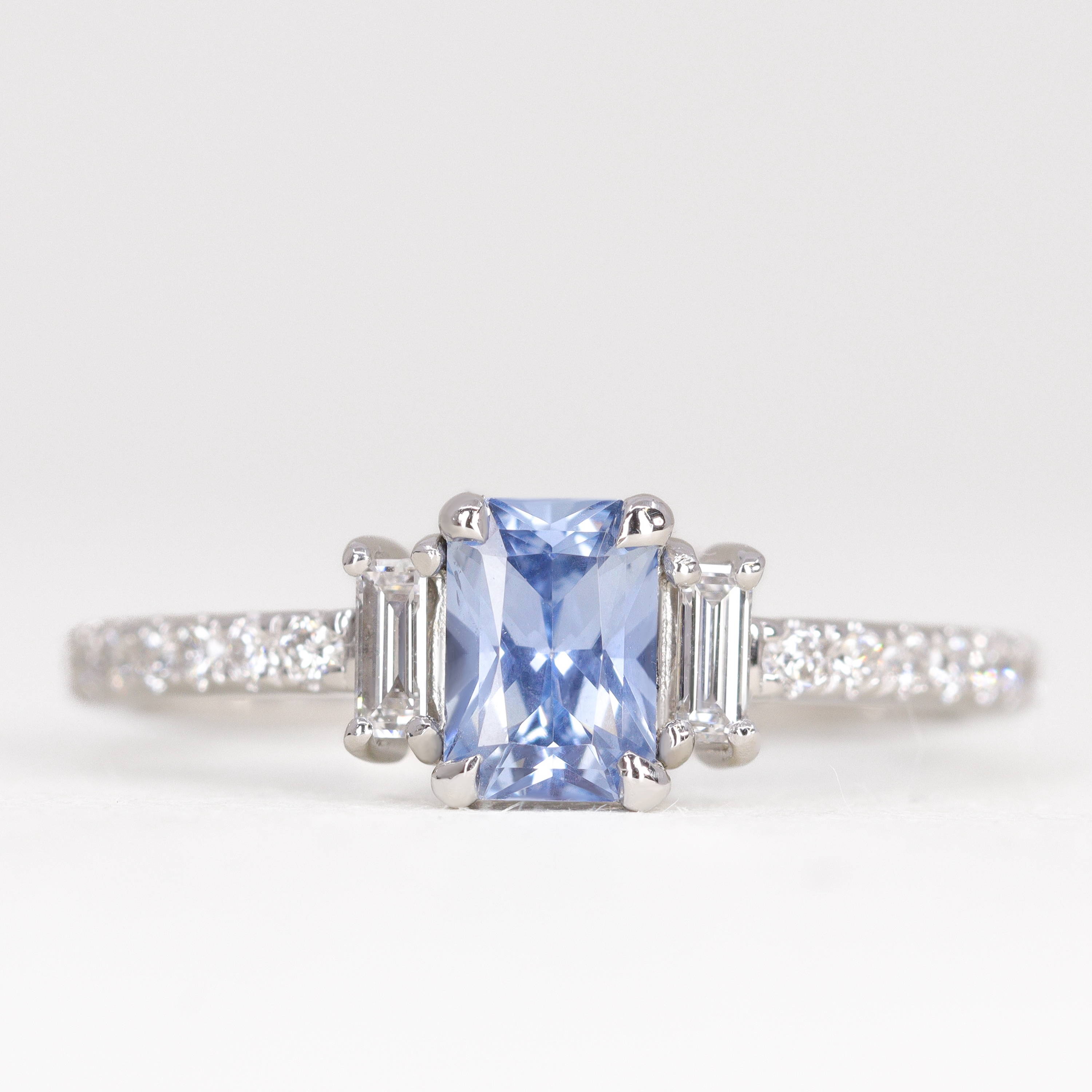 The Liberty ring had to be simple, clean and stunning. I chose a gorgeous pale blue sapphire, inspired by the pale sky blue tones featured on the album cover. I felt that the rectangular cut stones were reminiscent of the polaroid images that were included in the deluxe editions.