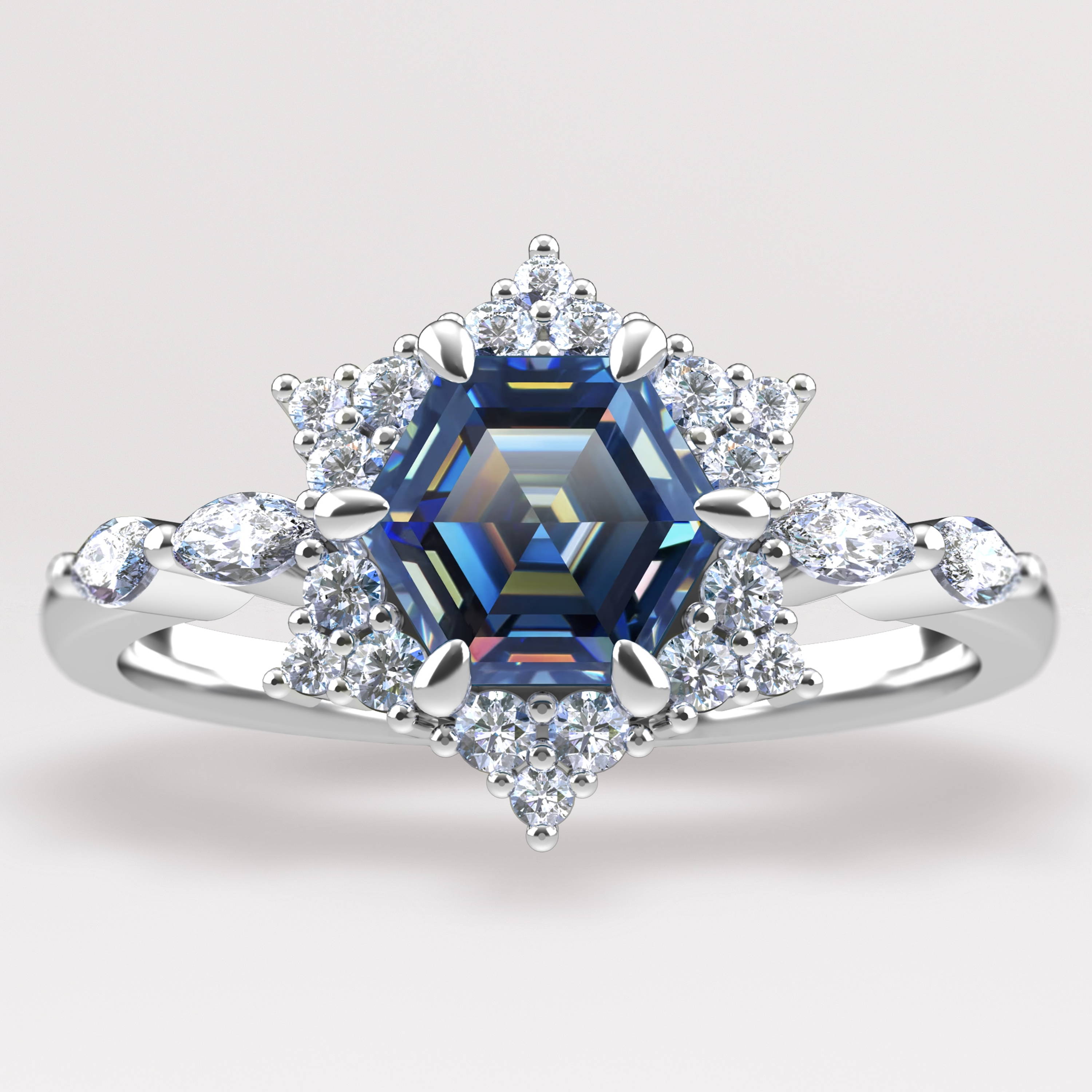 I may not be able to make the whole place shimmer, but this ring definitely can. Inspired by the night sky and Taylor’s gorgeous deep blue bodysuit during the Midnights section of the Era’s tour. This ring has some serious sparkle, with a hexagon cut blue moissanite, surrounded by round brilliant cut lab grown diamonds, and finished off with marquise cut lab grown diamonds on the shank for a more eye-catching shimmer.