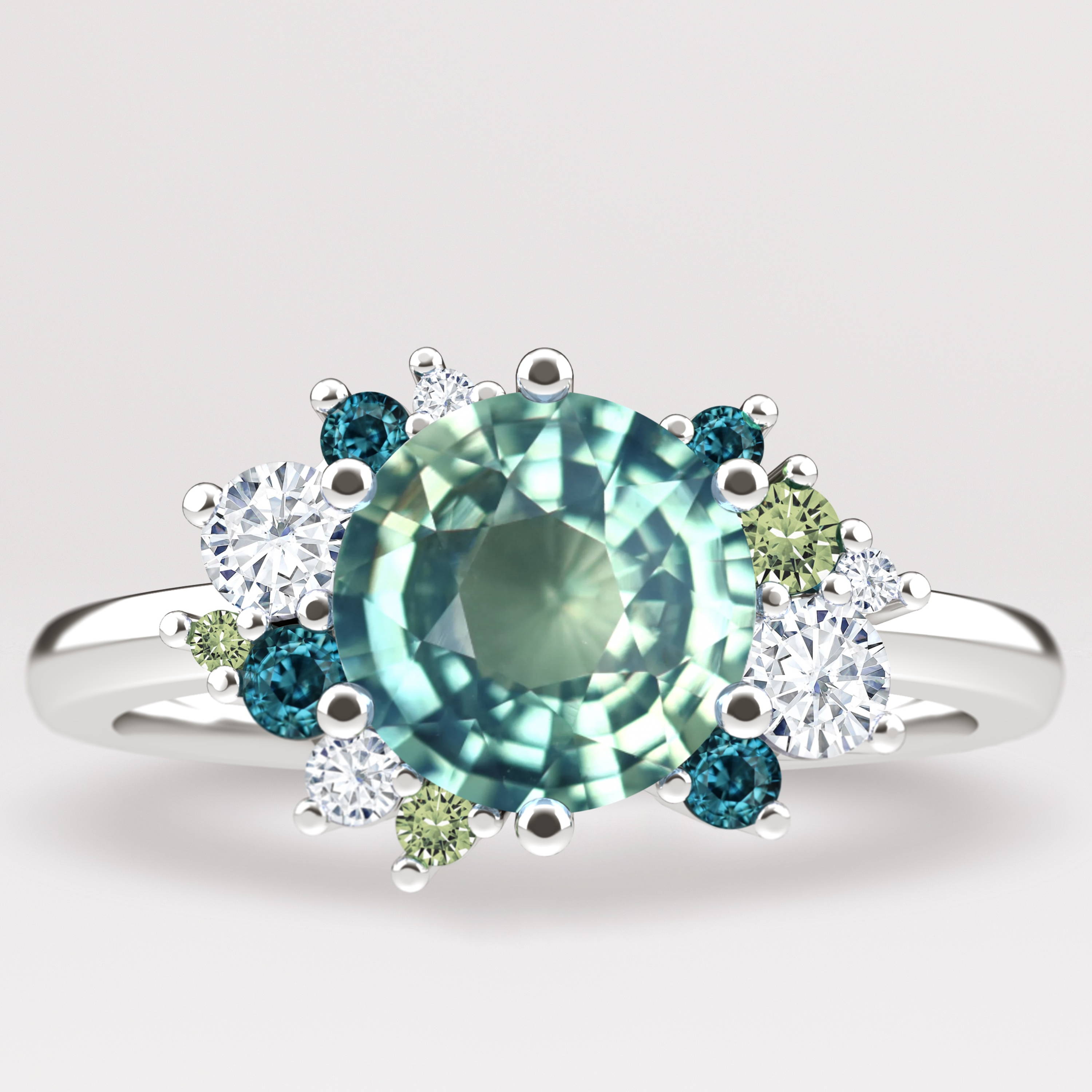 The Alison ring is inspired by the gorgeous colours within her Taylor Swift album cover, filled with gorgeous sea blues and greens and was a perfect ring to use our favourite teal sapphires in. The asymmetric clusters are reminiscent of the fabulous bouncy curls of her hair. Taylor was only 16 when her debut album was released, and some of the songs had been written as young as 12.
