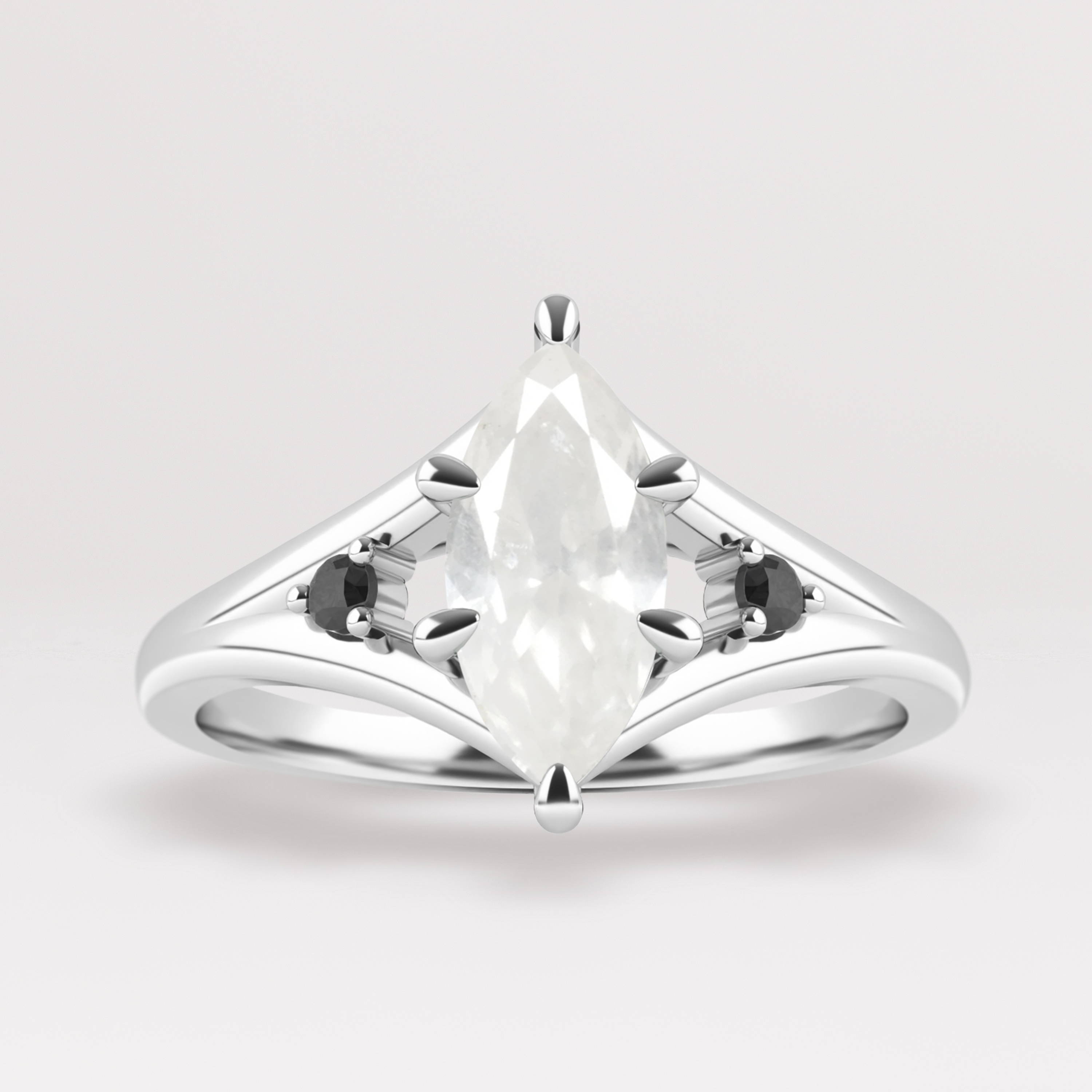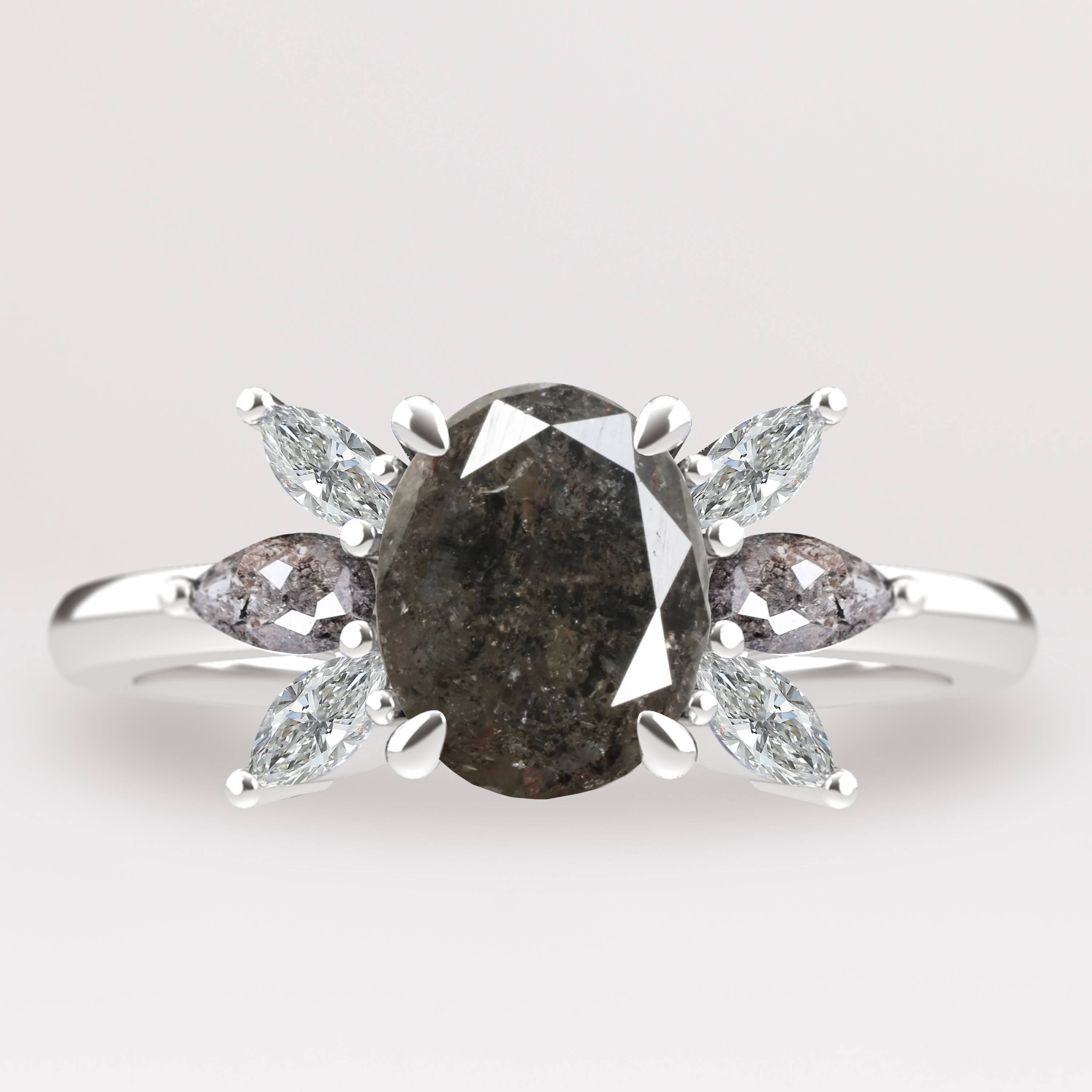 We've popped in to add Stevie to the mix - get moody with a opalescent salt and pepper diamond, black diamond accents, and a highly polished, sparkling split shank for that final je ne sais quoi...