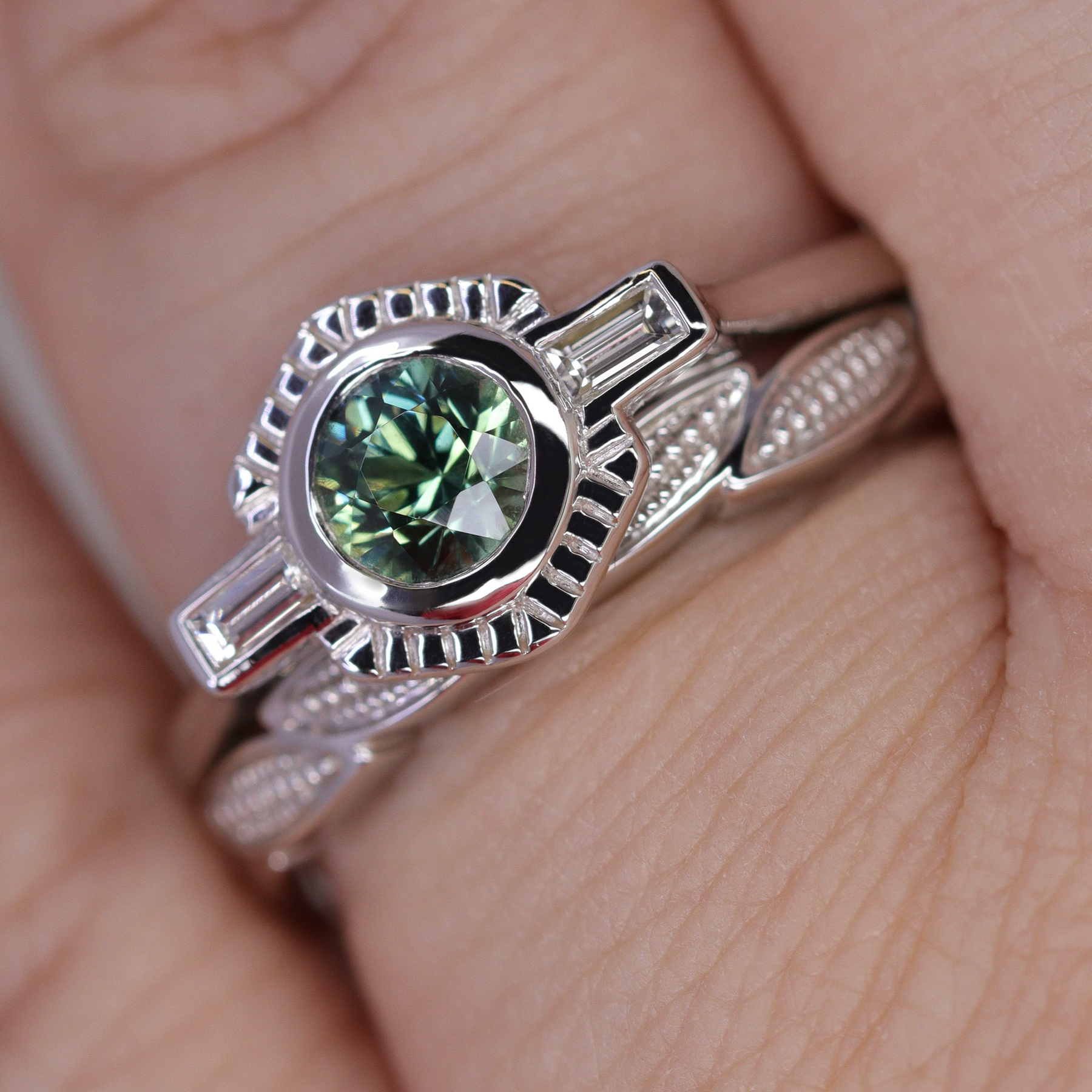 These vintage sweethearts are a stunning pair, with so many Art Deco features you'll think you've travelled back in time. Olivia's teal sapphire is a sight to behold, and the contrast between her geometric lines and the curves of Zoey's leafy goodness, this pairing is just chefs kiss